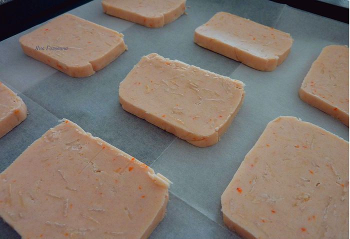 Вытащить тесто из морозилки (если тесто лежало в морозилке более трех часов, то нужно дать тесту минут 30 постоять перед нарезкой что бы не крошилось).
