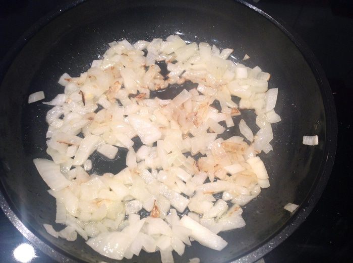 На сковороде с разогретым оливковым маслом обжарьте лук, помешивая, посыпьте сахаром и солью. Готовьте на тихом огне до золотистого цвета.