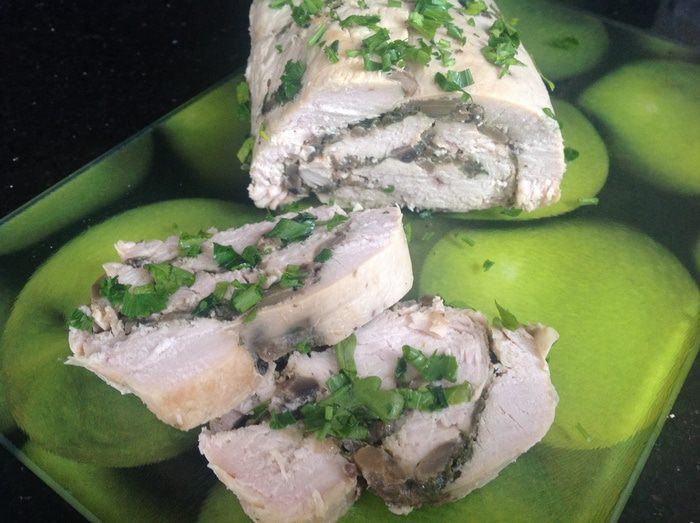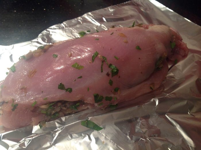 Аккуратно сверните филе рулетом. Заверните в фольгу, поставьте в духовку и запекайте 1,5 - 2 часа. Готовый рулет, не разворачивая оставьте отдохнуть, не менее 40 минут.