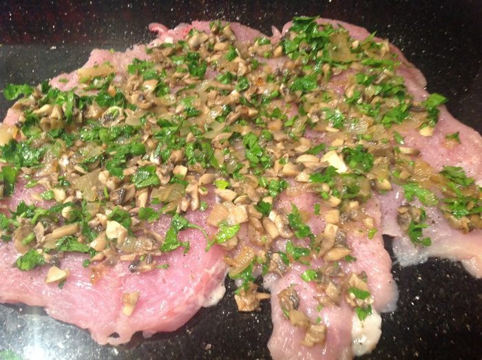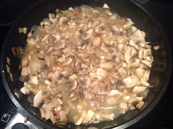 Мелко нарежьте шампиньоны, выложите на сковороду с луком, добавьте вино, готовьте помешивая пока вино не выпариться. Переложить в чашу, смешайте с мелко нарезанной петрушкой (немного петрушки оставьте для подачи).