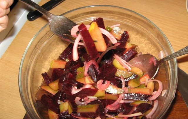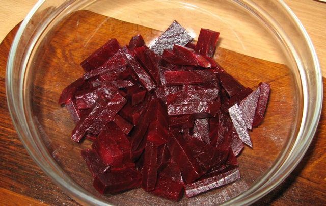 Свеклу отварить, почистить и нарезать соломкой.