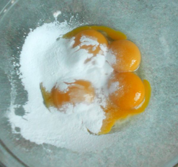 Тщательно размешайте желтки с сахарной пудрой в большой миске. Смесь должна быть жидкой и без большого количества пузырьков.