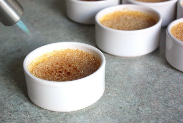 Перед подачей равномерно посыпьте сахаром примерно по 1 ст.л. на формочку и карамелизируйте кулинарной газовой горелкой или под грилем.