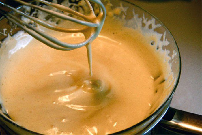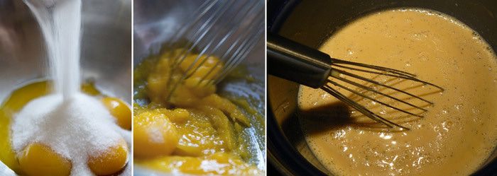 Желтки взбиваем с 100 г сахара. Нагреваем кремовый ликер и тоненькой струйкой вливаем в желтки. Затем отправляем крем на водяную баню и увариваем до загустения. Желатин (30 г) замочить со 100 г сахара и 150 мл воды на 10 минут. Отправить на плиту и прогреть до полного растворения сахара.