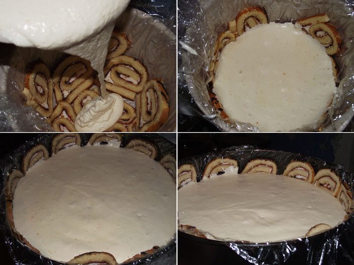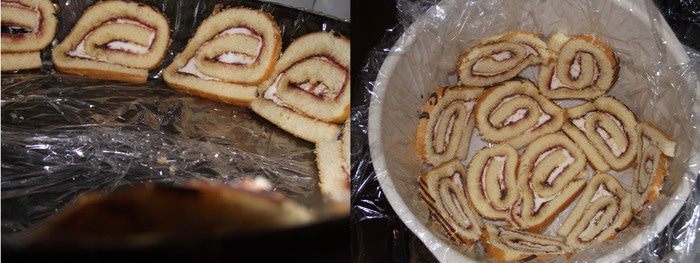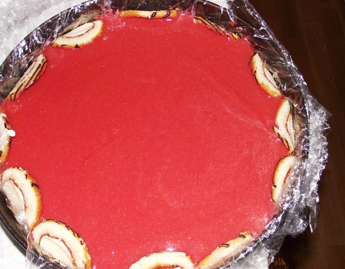 Пищевой пленкой «укутать» дно формы так, чтобы за края можно было извлечь торт из формы. Рулет нарезаем на тонкие ломтики и выкладываем на стенки или дно формы. 20 гр желатина замочить в 100 мл холодной воды с 100 гр сахара и лимонной кислотой.
