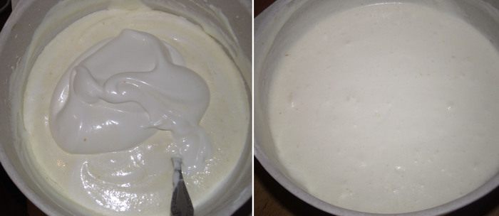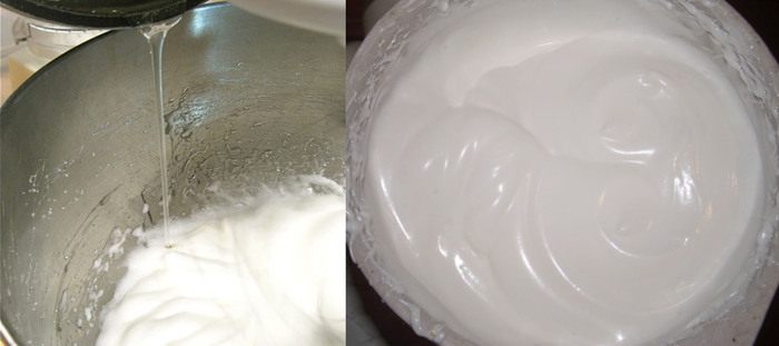 Белки взбиваем в крепкую пену постепенно добавляя 150 гр сахара. Затем тоненькой струйкой вливаем теплую желатиновую массу и ванильную эссенцию и не прекращая взбиваем на больших оборотах миксера.