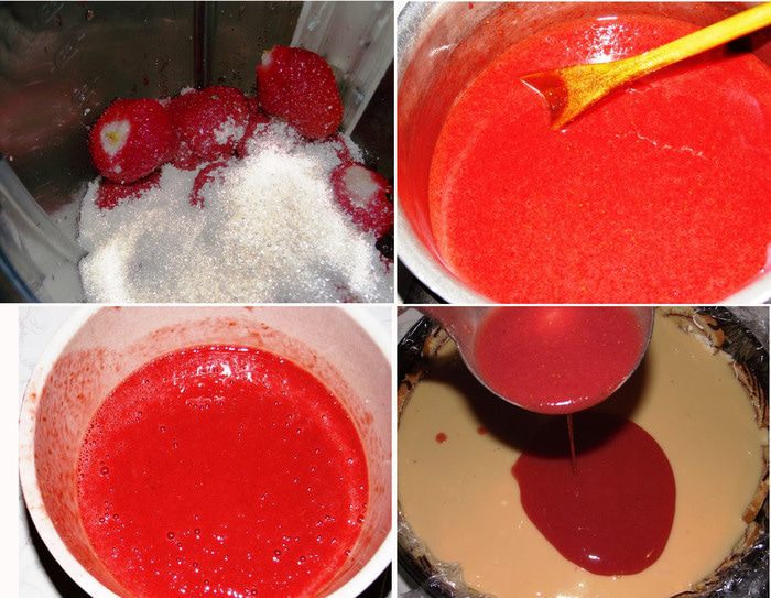 Клубнику со 100 г сахара взбить в блендере. Отправить в кастрюльку, добавить шампанское и проварить 2-3 минутки. Отсудить. Желатин с сахаром ( 50 г) и водой (50 мл) нагреваем на плите и соединяем с клубничным пюре. Выливаем остывший крем на слой и отправляем в холодильник.