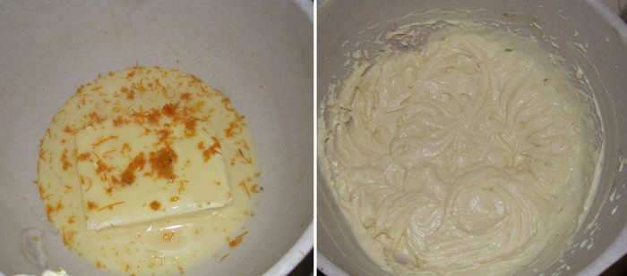 Соединяем цедру апельсина, мягкое сливочное масло и сгущенное молоко, взбиваем массу миксером до образования пышного крема.