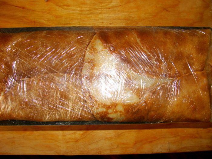 Завернуть в пищевую пленку и поставить под пресс не меньше чем на 10 часов. После этого, я убрала рулет в холодильник на ночь.