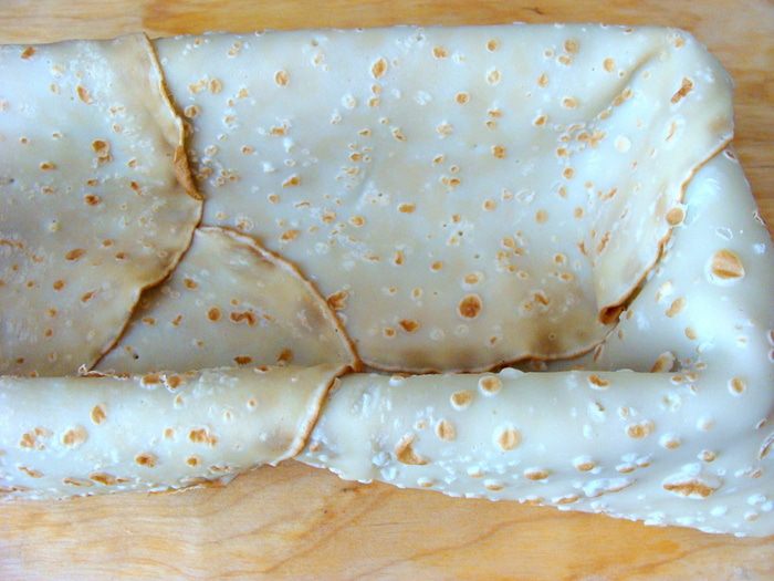 Форму для выпечки хлеба выложить блинами так, чтобы края сильно свешивались. Смазать теплым сливочным маслом.
