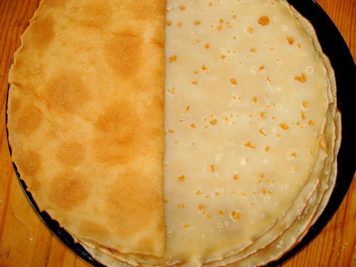 Делаем тесто для блинчиков из перечисленных продуктов. Тесто должно быть жидкое, количество муки регулируйте. Чтобы готовое тесто насытить кислородом, надо его почерпать половником и, поднимая его, повыше выливать.