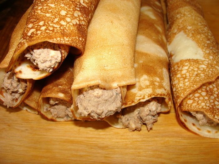 В центр положить сырный рулетик. Блинчики смазать маслом.