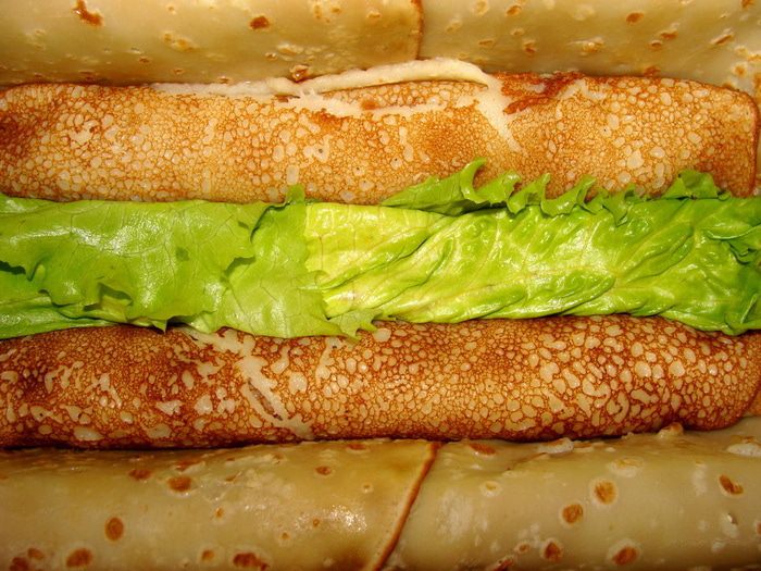 Следующий слой наоборот. В центре мясной блинчик,