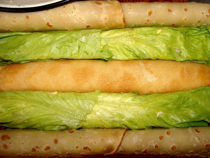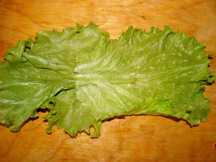 У листиков салата оборвать нижнюю часть. Для одного рулетика понадобится два листика. Положить их внахлест.