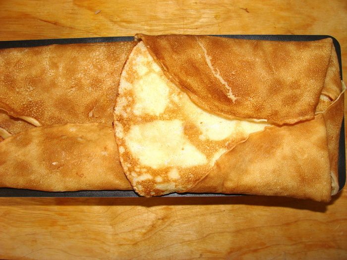 Завернуть свисающие концы блинчиков, смазывая их маслом или белком.