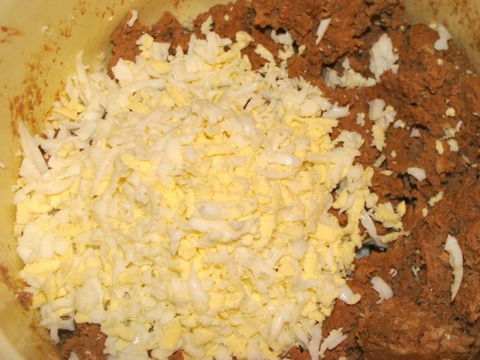 Перемешать получившийся мясной фарш и измельченную печень. Отварные яйца потереть на терке. Добавить сливки.