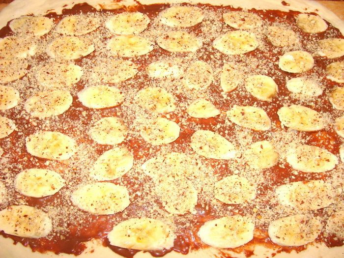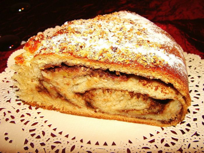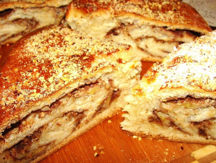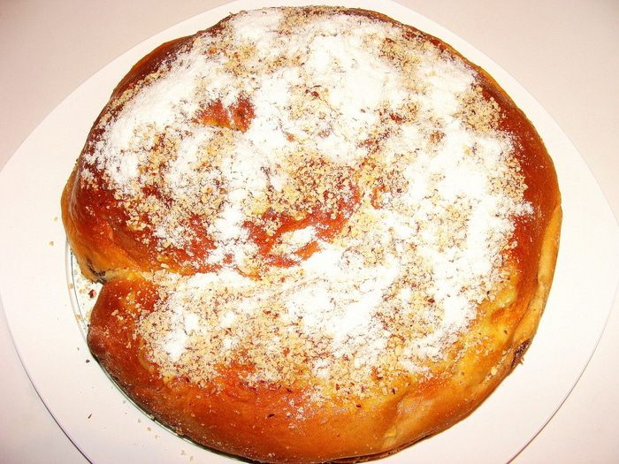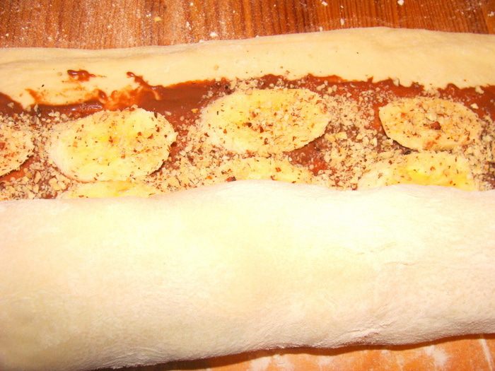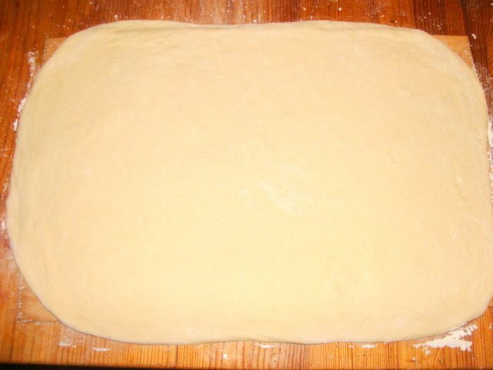 Дрожжи развести в теплой воде с 1 с/л сахара, дать подойти, добавить масло, муку, ванилин, оставшийся сахар, замесить тесто. Вымесить миксером 10 минут. накрыть, оставить в теплом месте. Когда тесто поднимется в 2-3 раза, обмять его и дать подойти еще раз. Разделить на две части, т.к. из этого количества получается 2 пирога. Выпекаются они в форме диаметром 26 см. Раскатать одну часть теста в виде прямоугольника толщиной 7-8 мм.