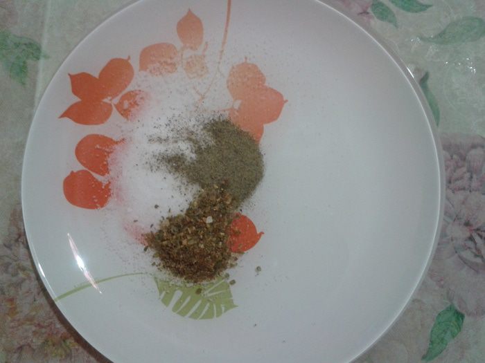 Смешать соль, перец и специи по вкусу (ароматные травы).
