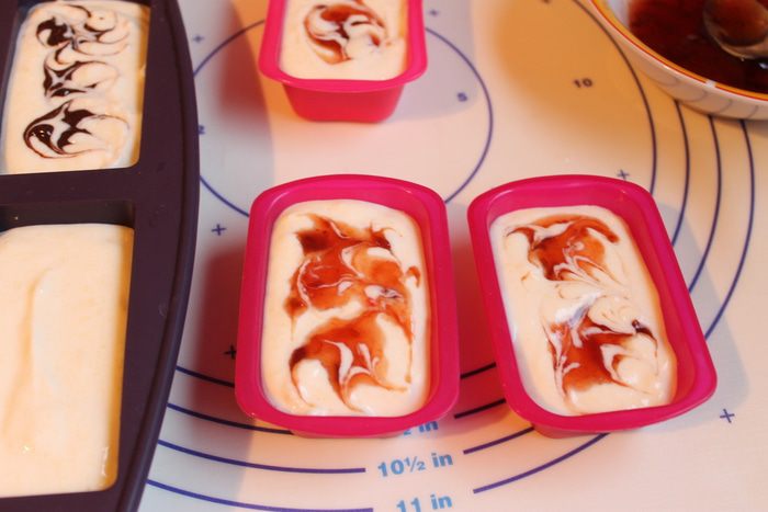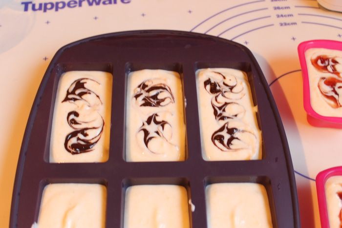 Разливаем по формочкам (формочки можно взять обычные для маффинов). Шоколад растапливаем. Джем тоже разогреем в микроволновке.