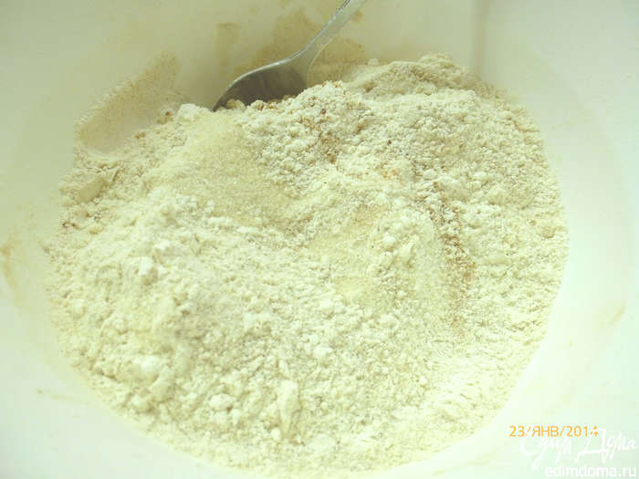 В отдельной чаше смешиваем сухие составляющие: муку, сахар, разрыхлитель, соль и молотую корицу.