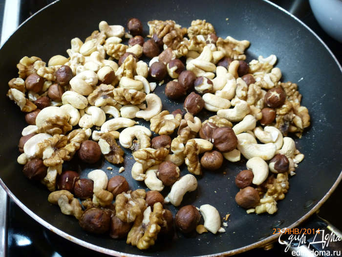 Орехи слегка обжариваем на сковороде. Я использовала фундук, кешью и грецкий орехи.