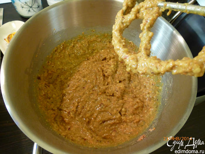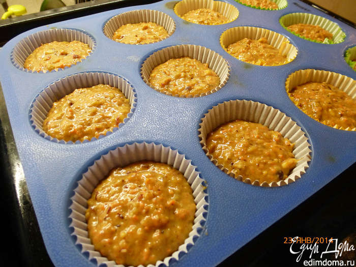 К жидкой части добавляем сухую, тщательно перемешиваем. Далее добавляем измельченные овощи-фрукты-орехи, перемешиваем.