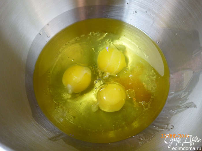 В чаше смешиваем до однородности жидкие составляющие: яйца, масло, ванильный экстракт. Масло нужно брать без запаха. Отлично подойдет масло виноградных косточек, его и использовала.