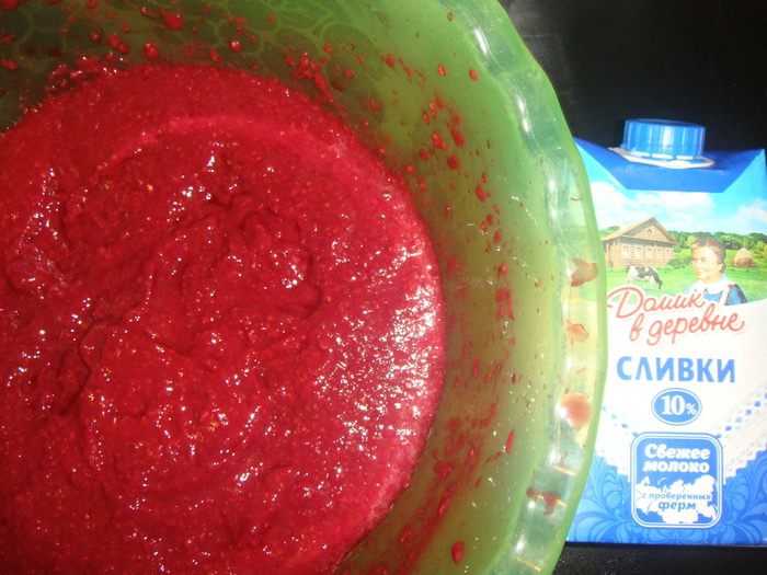 Теперь приготовим малиновый мусс : малину разморозить и пюрировать блендером. Перетереть через сито.