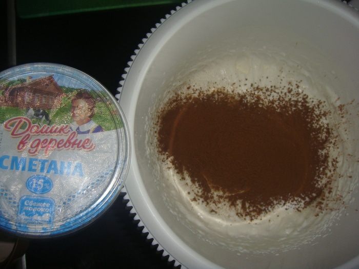 К взбитым сливкам добавить сметану, просеять сахарную пудру и какао. Взбить все в течение 5 минут.