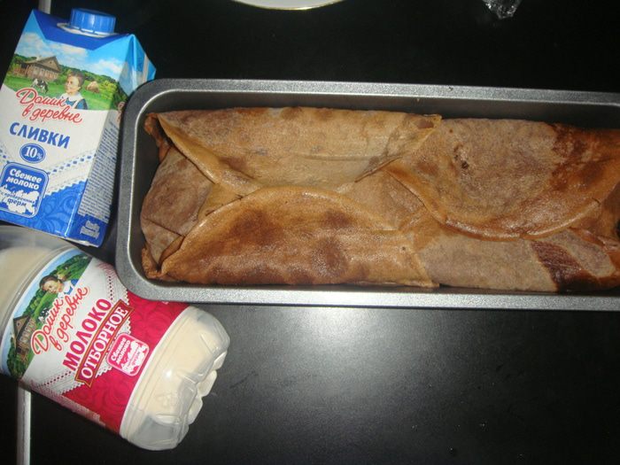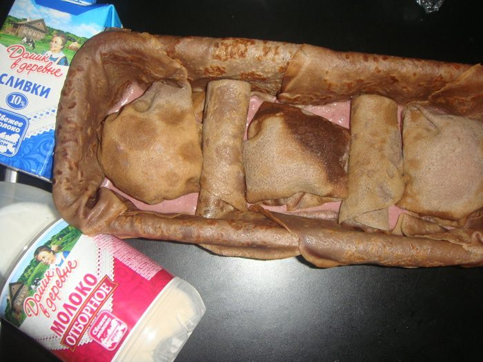 Теперь соберем тортик: блинчики из кружек выложить в основную форму на застывший мусс. В промежутках уложить блинчики, свернутые трубочкой.