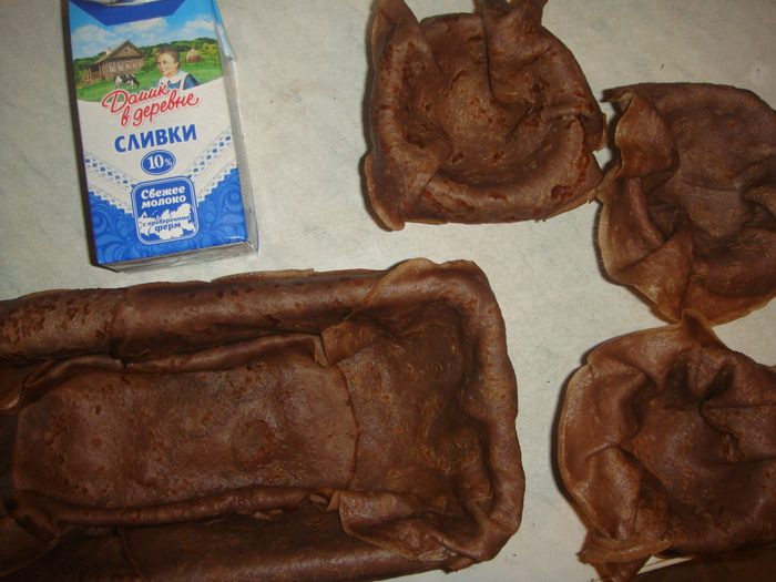 Форму для торта выложить блинами. В три небольших миски или кружки положить по блинчику.