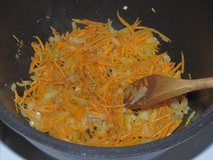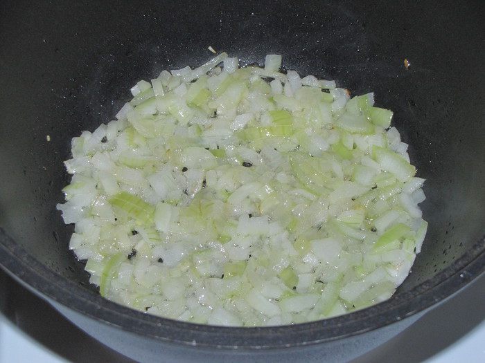В сотейнике или кастрюле с толстым дном разогреть оливковое масло и обжарить лук до мягкости.