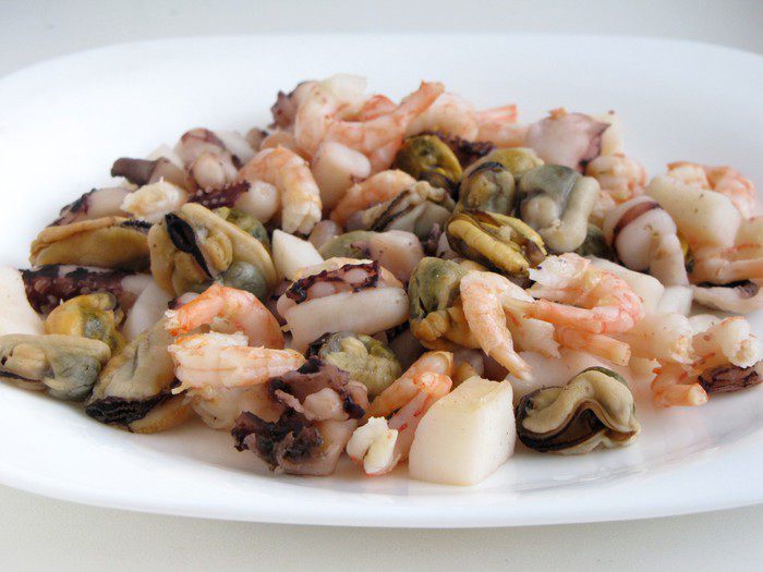 Морепродукты (мидии, креветки, щупальца осьминога, кальмары) отварить в подсоленой воде в течении 5 минут. Отбросить на дуршлаг.