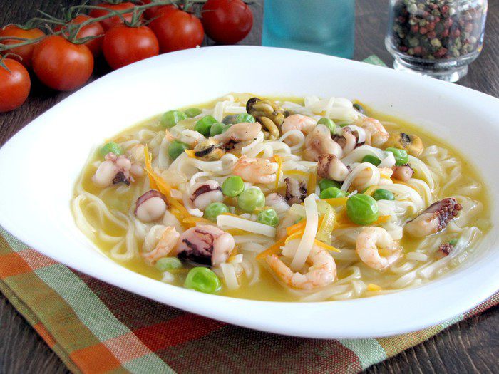 Через минуту опустить горошек и морепродукты. Горошек должен быть предварительно разморожен. Посолить и поперчить по вкусу. Варить еще полторы минуты.