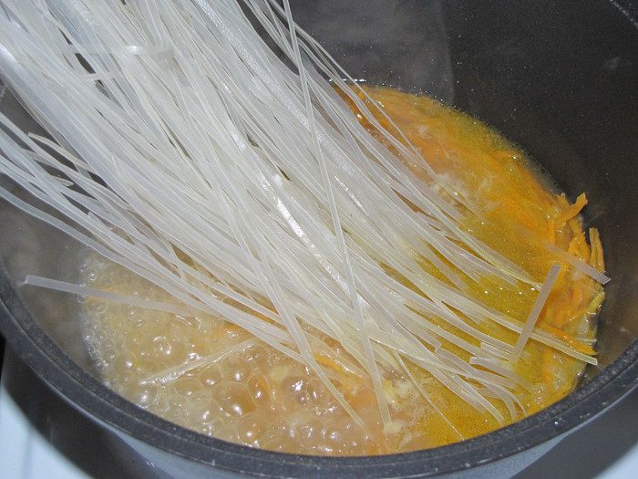 Когда бульон закипит, опустить фунчозу.