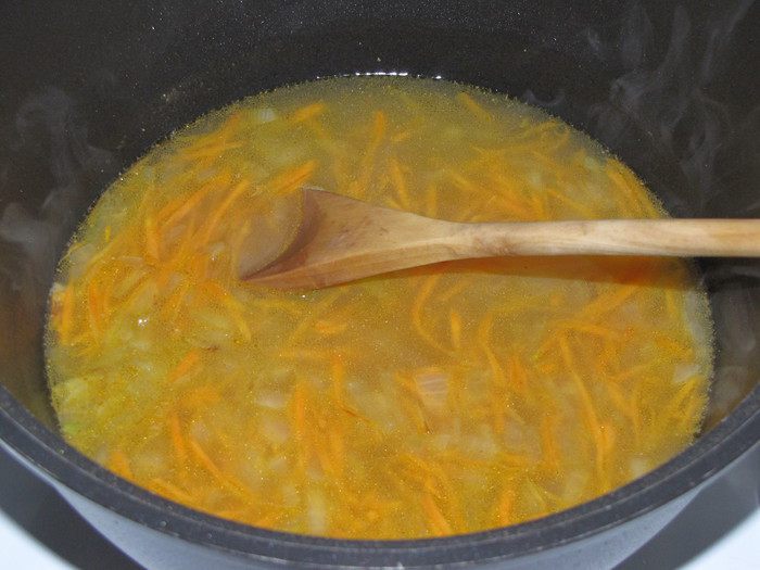 Влить куриный или мясной бульон. Если вы его готовили заранее, то предварительно разогреть.