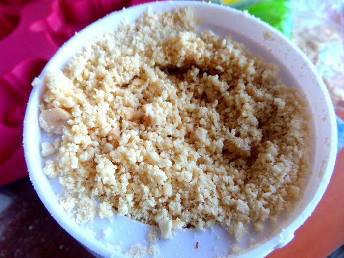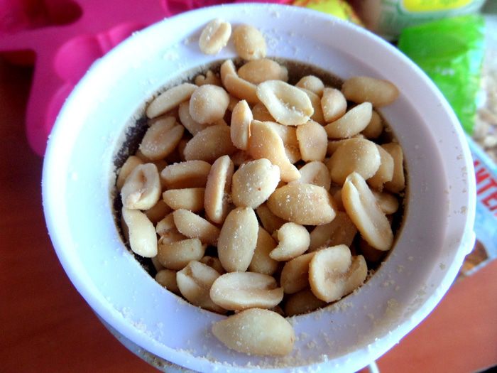 Очищенный арахис у меня слегка обжаренный и присоленный (это даже придало интригу для вкуса и прекрасно вписалось в сладость кексов).