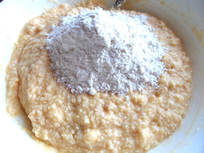 Высыпаем просеянную муку вместе с разрыхлителем.