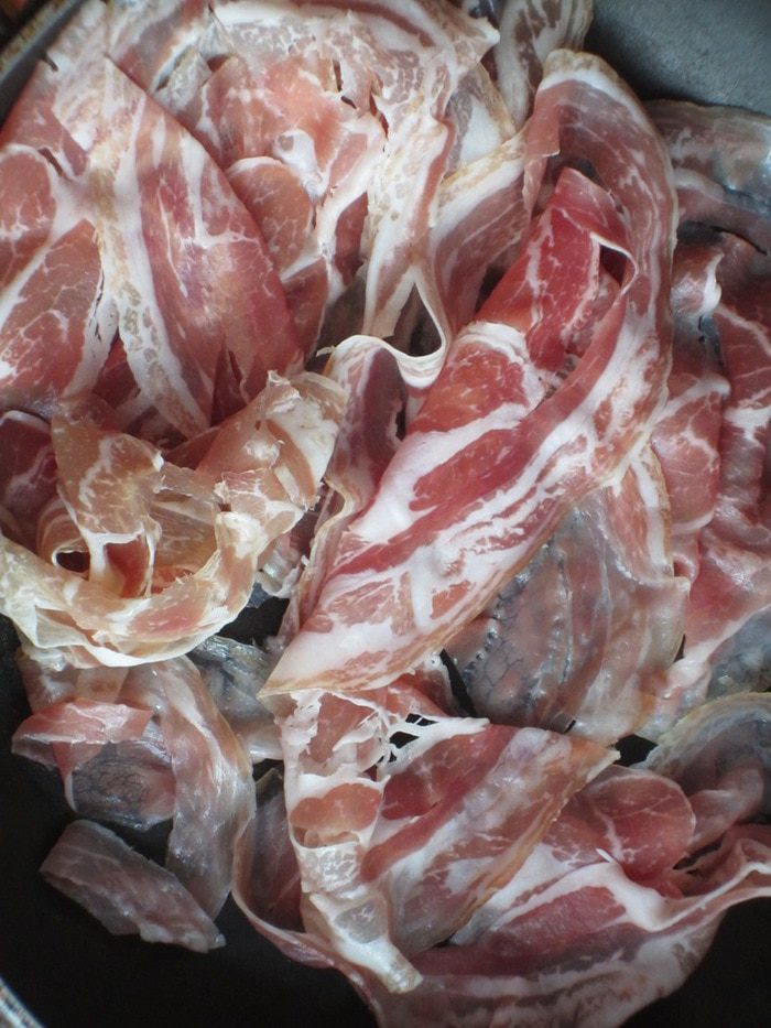 Бекон обжарить до золотистого цвета на сухой сковороде с антипригарным покрытием.