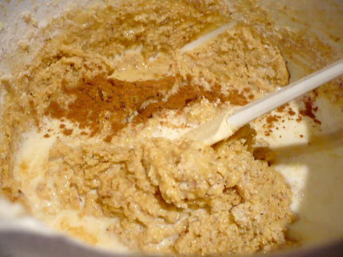 Добавим в яично-масляную массу, смешанную с мукой и манкой, щепотку соли, ванилин, имбирь, корицу, молоко и апельсиновый сок. Перемешаем хорошенько. Из обычного сахара и 40 мл воды сварим сироп, доведя сахар до растворения.
