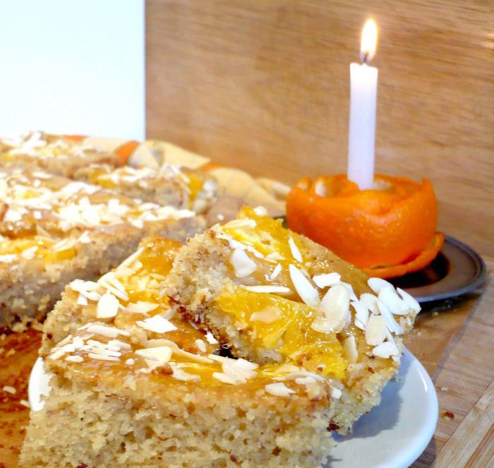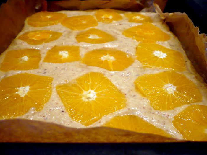 В застеленную бумагой для выпечки форму (у меня прямоугольная, также подойдет и круглая форма диаметром 26 см) выложим тесто, разровняем. Каждый ломтик апельсина опустим в сироп и выложим на тесто. Пирог поставим в духовку на 40 — 45 минут.