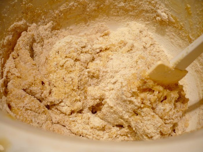 Духовку разогреем до 180 градусов. Муку смешаем с молотым миндалем, пекарским порошком и манной крупой. Масло взобьем с коричневым сахаром, введем яйца по одному. Введем мучную смесь. Перемешаем лопаточкой до однородности.