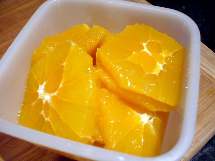 Из одного апельсина выжмем сок. С трех других апельсинов срежем толстый слой кожуры, сняв таким образом и самую горькую белую часть с апельсинов. Нарежем апельсины колечками примерно по 5 мм шириной.