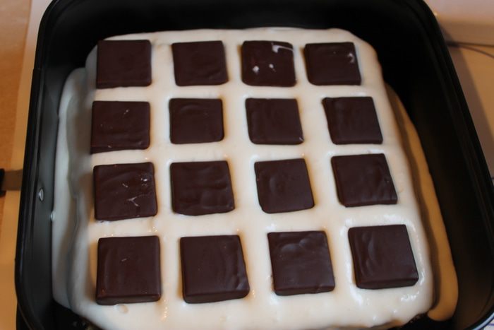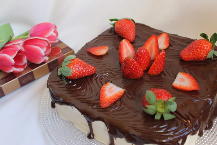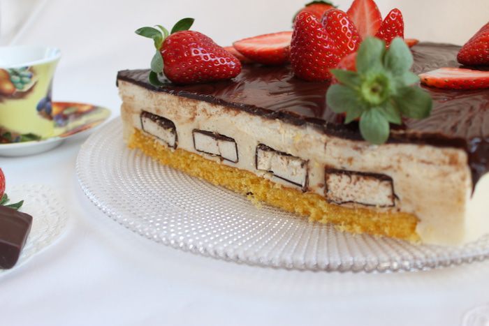 Берем форму с бисквитом, наливаем наш крем, половина. Выкладываем конфеты "Птичье молоко". Стараемся их класть ровно и расстояние не должно быть большим между ними. Заливаем остальным кремом. Убираем в холодильник на ночь. Утром я прошлась по бокам формы феном, быстро, горячим воздухом. Снимаем форму. Делаем глазурь. Сливки нагреваем и смешиваем с шоколадом. Хорошо размешаем и выливаем на середину торта. разравниваем шпателем кулинарным и слегка делаем сбоку такие подтеки.