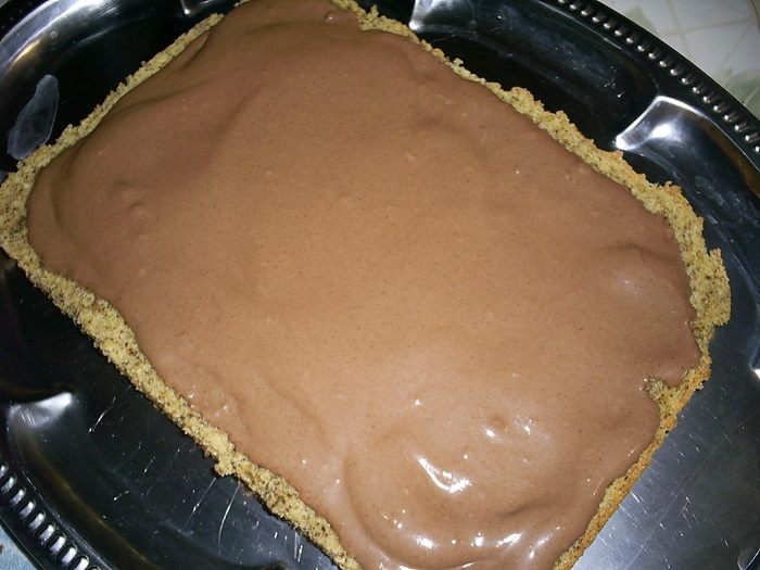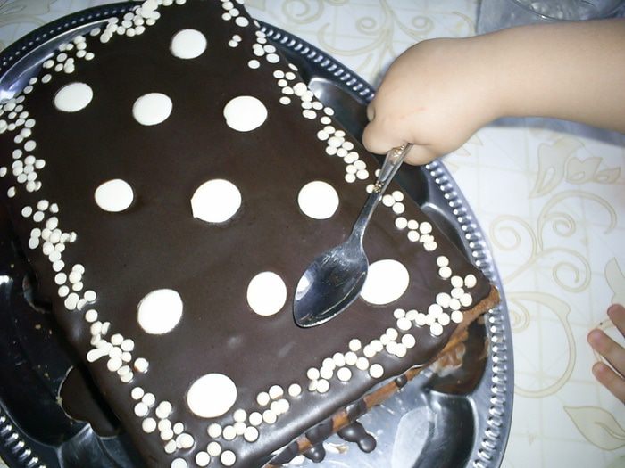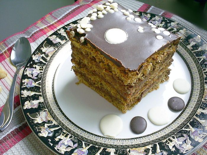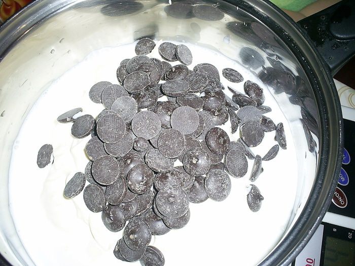 Затем кладем сверху второй пласт бисквита, срезом вниз. Снова шоколадный крем, бисквит срезом вверх, крем, бисквит срезом вниз. Бока торта обмазываем шоколадным кремом. Верх поливаем глазурью. Для глазури шоколад растопить со сливочным маслом, дать немного остыть и покрыть верх торта. Украсить по своему усмотрению, я использовала готовые диски и "капельки" из белого шоколада.