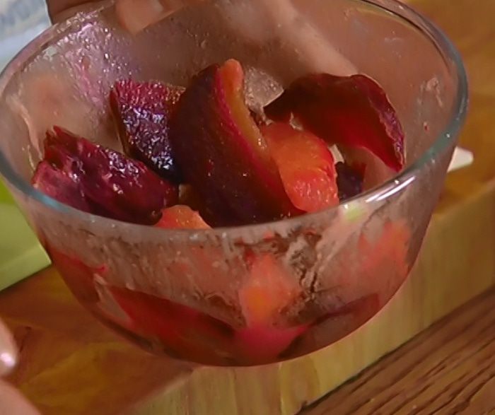 Свеклу запечь, затем почистить и нарезать небольшими дольками.