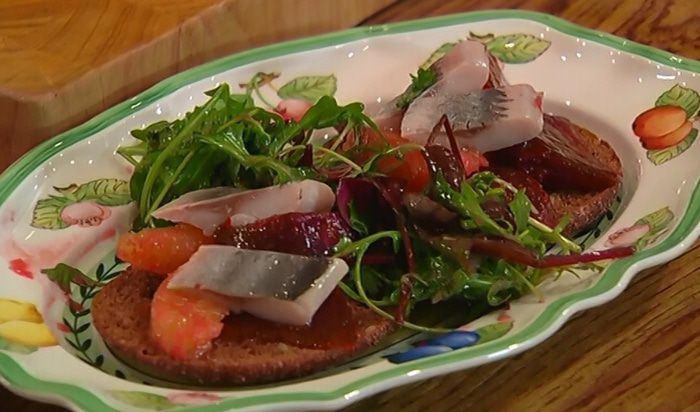 На куски хлеба выложить апельсиновую мякоть со свеклой, кусочки сельди и подавать с заправленными салатными листьями.