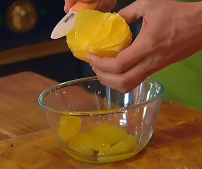 С апельсина срезать кожуру и вырезать мякоть из перепонок, сохранив выделившийся при этом сок.