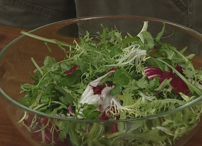 Листья салата перемешать с нарезанной кинзой, полить сохраненной апельсиновой заправкой, сбрызнуть оставшимся оливковым маслом и перемешать.