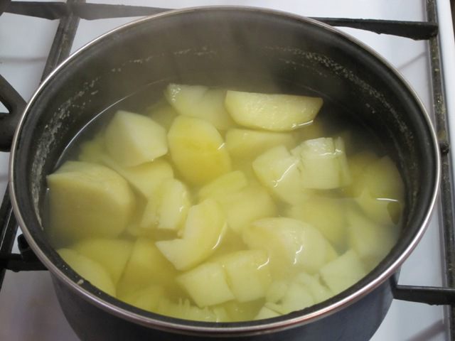 А сейчас самое время заняться начинкой. Будет 2 начинки: картофельная и грибная. Картофель вымыть, очистить, нарезать. Заложить в кипяток, посолить. Варить 20 минут.